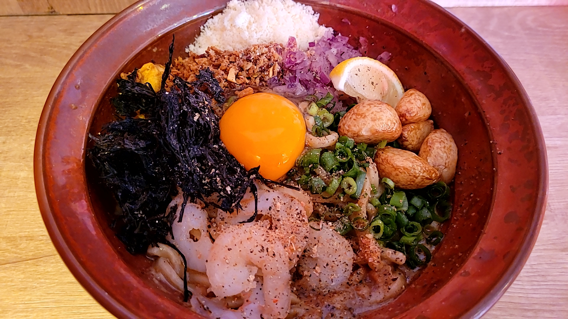 【濃厚豚ボナーラ ポルコ】海老ボナーラまぜそば2022.07.232022.08.15注文リスト海老ボナーラ ¥1100トッピングニンニク ¥150チーズ ¥150レビュー麺4.0スープ4.0具4.5ビジュアル4.0コスパ3.0総合評価3.9店舗情報店名:濃厚豚ボナーラ ポルコ住所:東京都葛飾区東新小岩1-2-1営業時間:11:00~23:00定休日:無休
